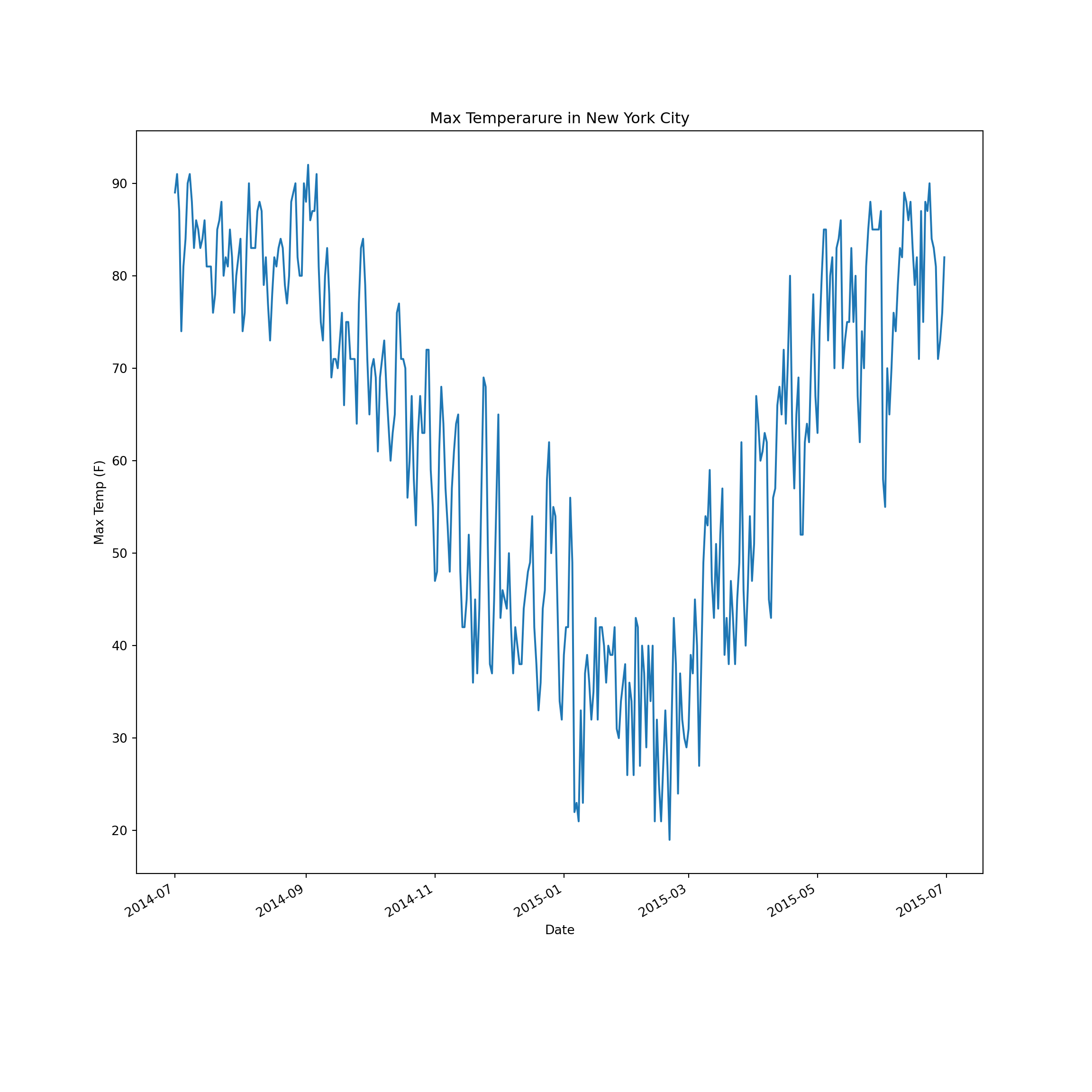 ax.set(xlabel="Date", ylabel="Max Temp (F)", title="Max Temperarure in New York City")## [Text(0.5, 0, 'Date'), Text(0, 0.5, 'Max Temp (F)'), Text(0.5, 1.0, 'Max Temperarure in New York City')]